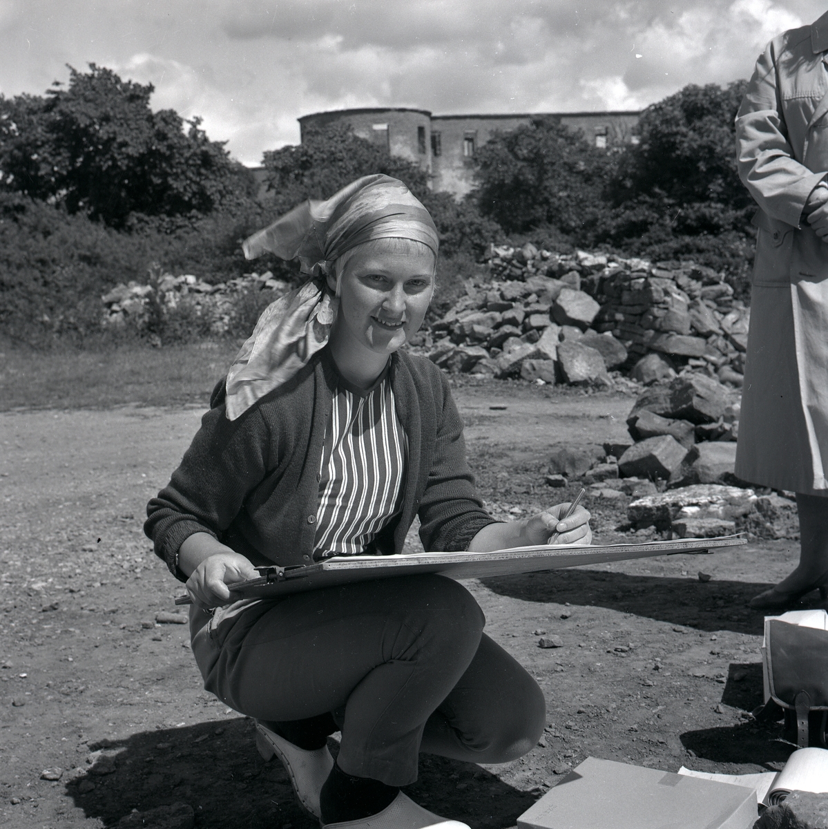 Titel: Arkeologiska utgrävningar sydost om Borgs kyrka vid Borgholms slottsruin. Det konstaterades tre medeltida bebyggelsenivåer från 1100-talet till 1300-talets slut. Källa: Grävda minnen Från Skedemosse till Sandby borg. Redaktör Kjell-Håkan Arnell & Ludvig Papmehl-Dufay, text av Stibéus.