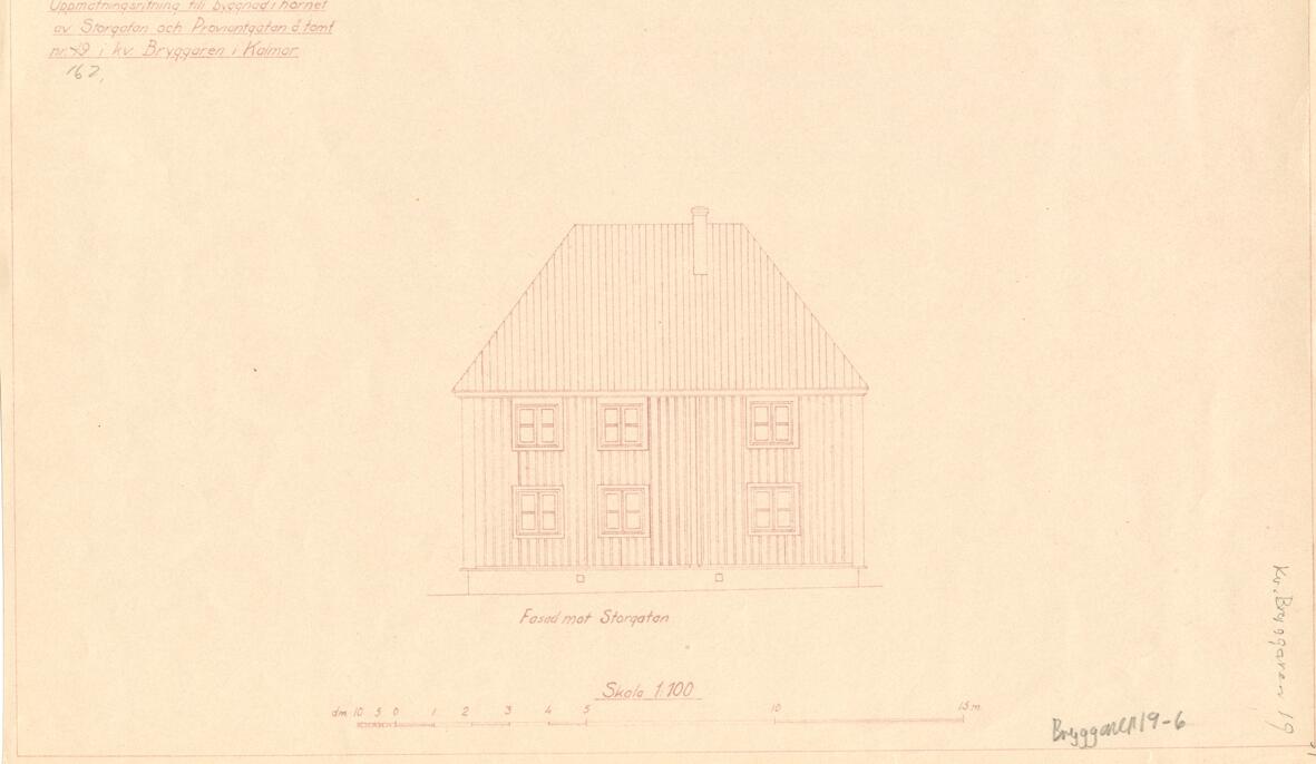 Uppmätningsritning av fastigheten Bryggaren 19, i hörnet av Storgatan och Proviantgatan. Fasad mot Storgatan.