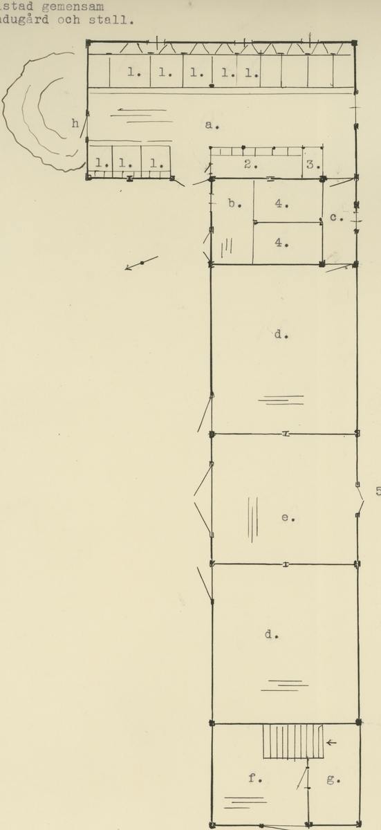 Plan av ladugård i Långeruda. a. Ladugård 1. Bås 2. Kalvkätte 3. Kätte b. Stall 4. Spilta med krubba c. Sadelkammare d. Lada e. Loge 5. Loglucka f. Sädbod g. Bod h. Gödselstad gemensam för ladugård och stall.