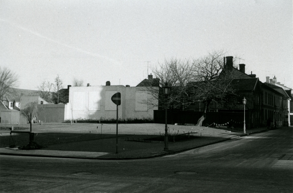 Vy från kv. Skrivaren. Bostadshus i bakgrunden. Till vänster Västra Sjögatan, till höger Norra Långgatan.