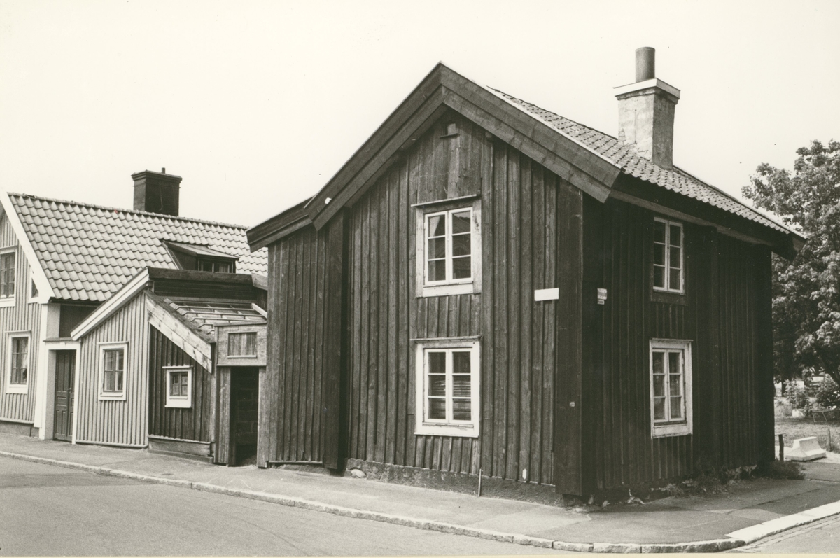 Byggnadsinventering juni 1974, fasad mot Norra Långgatan - Landshövdingegatan. Byggnaden inhyser numera galleri Rackaregården. Bilderna är tagna inom ramen för Kalmar kommuns inventering av Kvarnholmens bebyggelse 1974 och skänkta till länsmuseet.