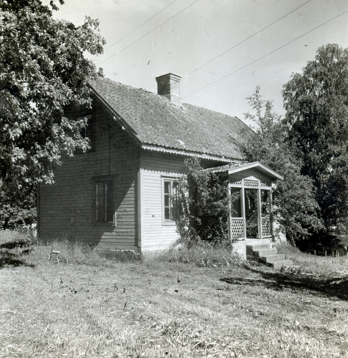 Bostadshus med träfasad, sadeltak, trappa och veranda, Valåkra by.