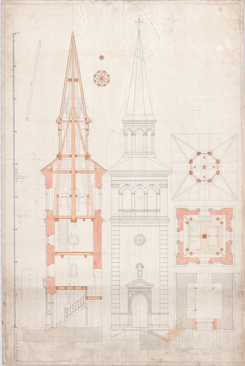 Kolorerad arkitektritning av Hugo Hammarskjöld. Projekt: Marbäcks kyrka, torn. Aneby pastorat. Ritning utan årtal. Tornet byggdes 1879.