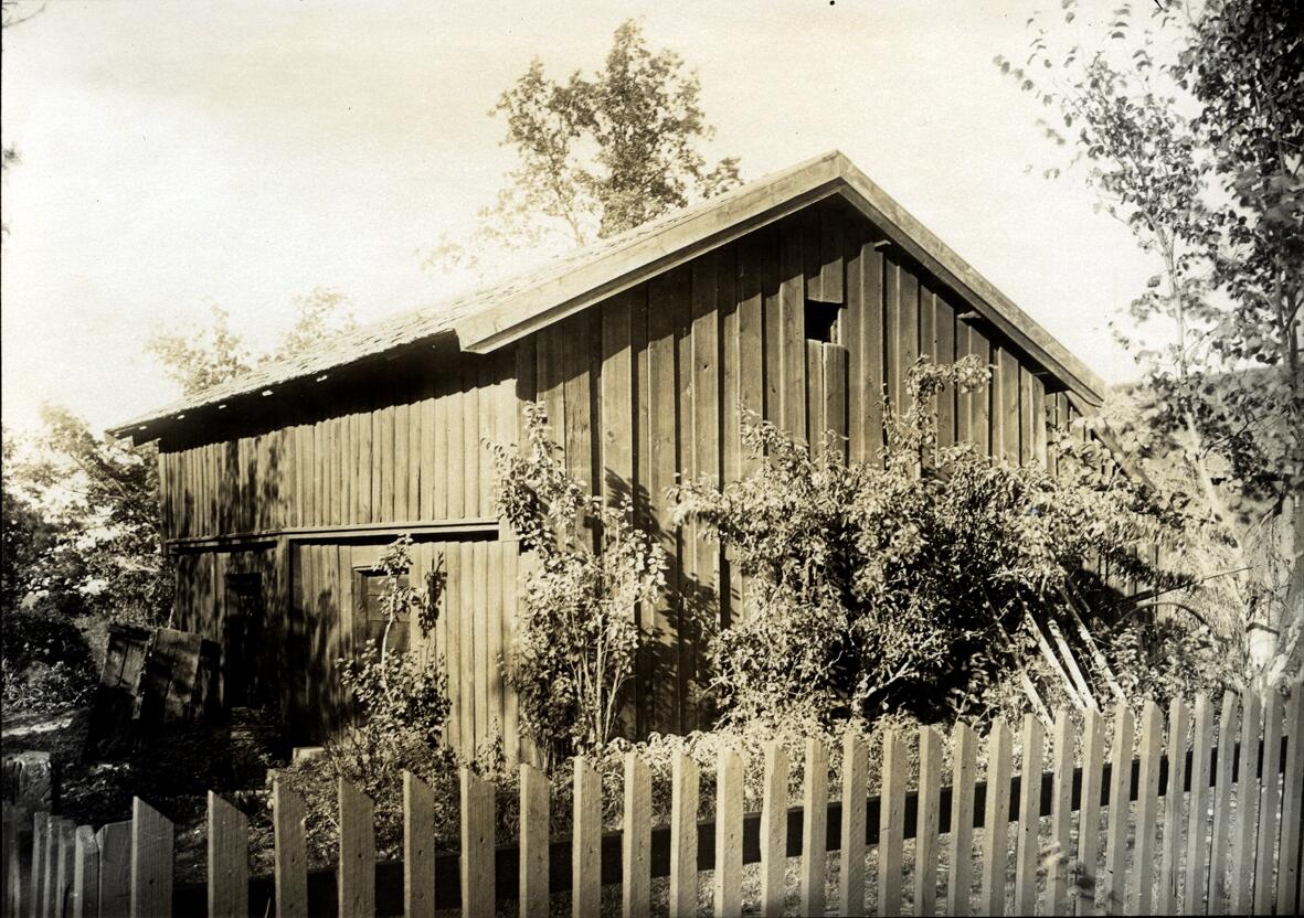 Komministergården i Pelarne. Bod med utskjutande överbotten. Svalen nertill är inklädd med bräder.