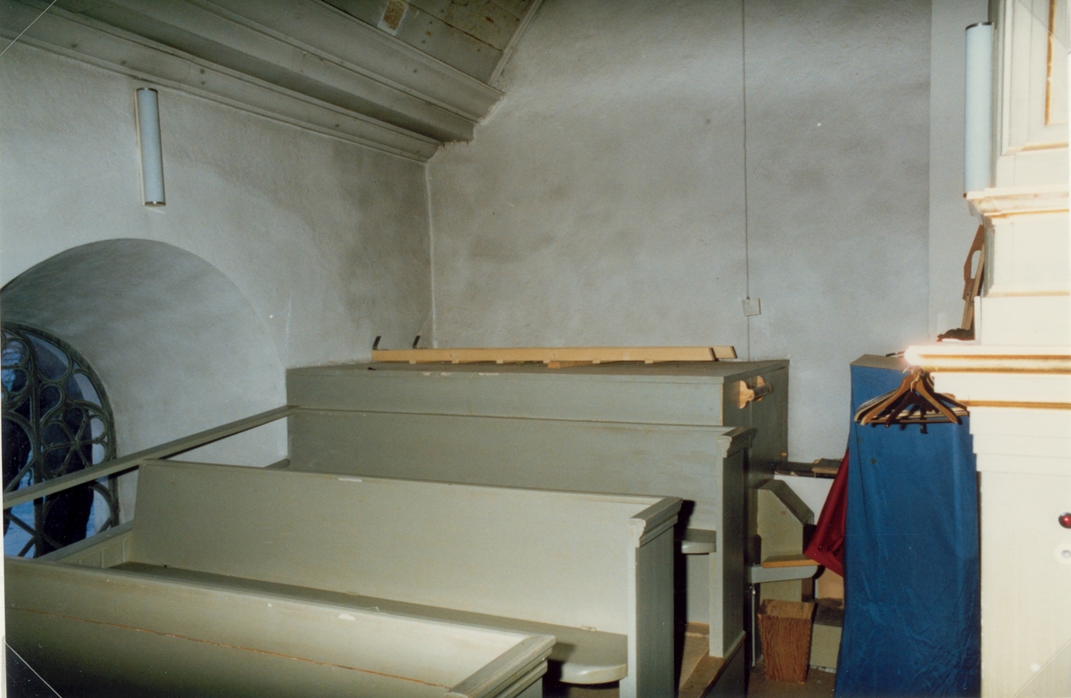 Kyrkbänkar på orgelläktaren i Mortorps kyrka.