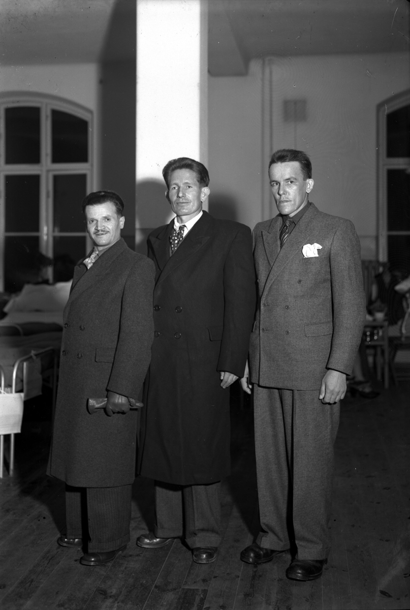 Tre män som räddats från Bergen-Belsen och kommit till Kalmar med skeppet Prins Carl fotograferade på Beredskapssjukhuset.