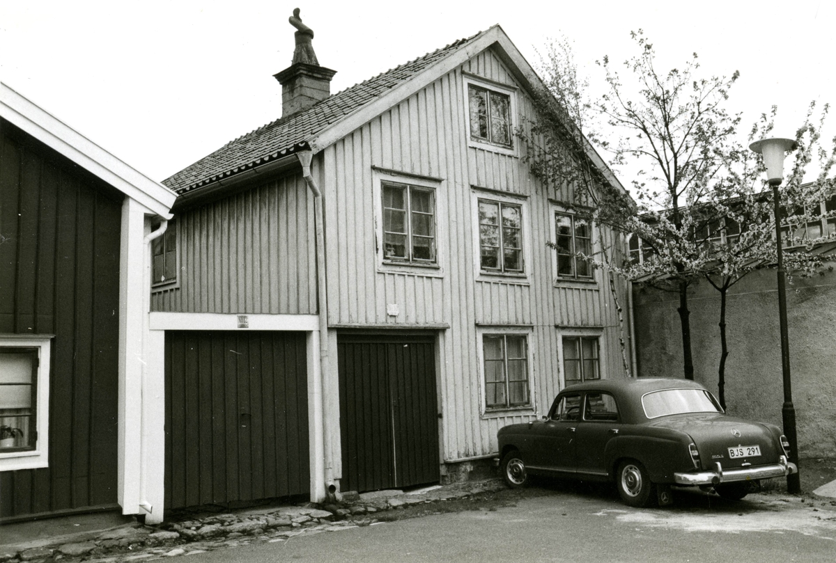 Kvarter Laxöringen 21 på Norra Malmgatan i Kalmar. Bostadshus med lockläktpanel och port, en bil står parkerad nära framför huset.