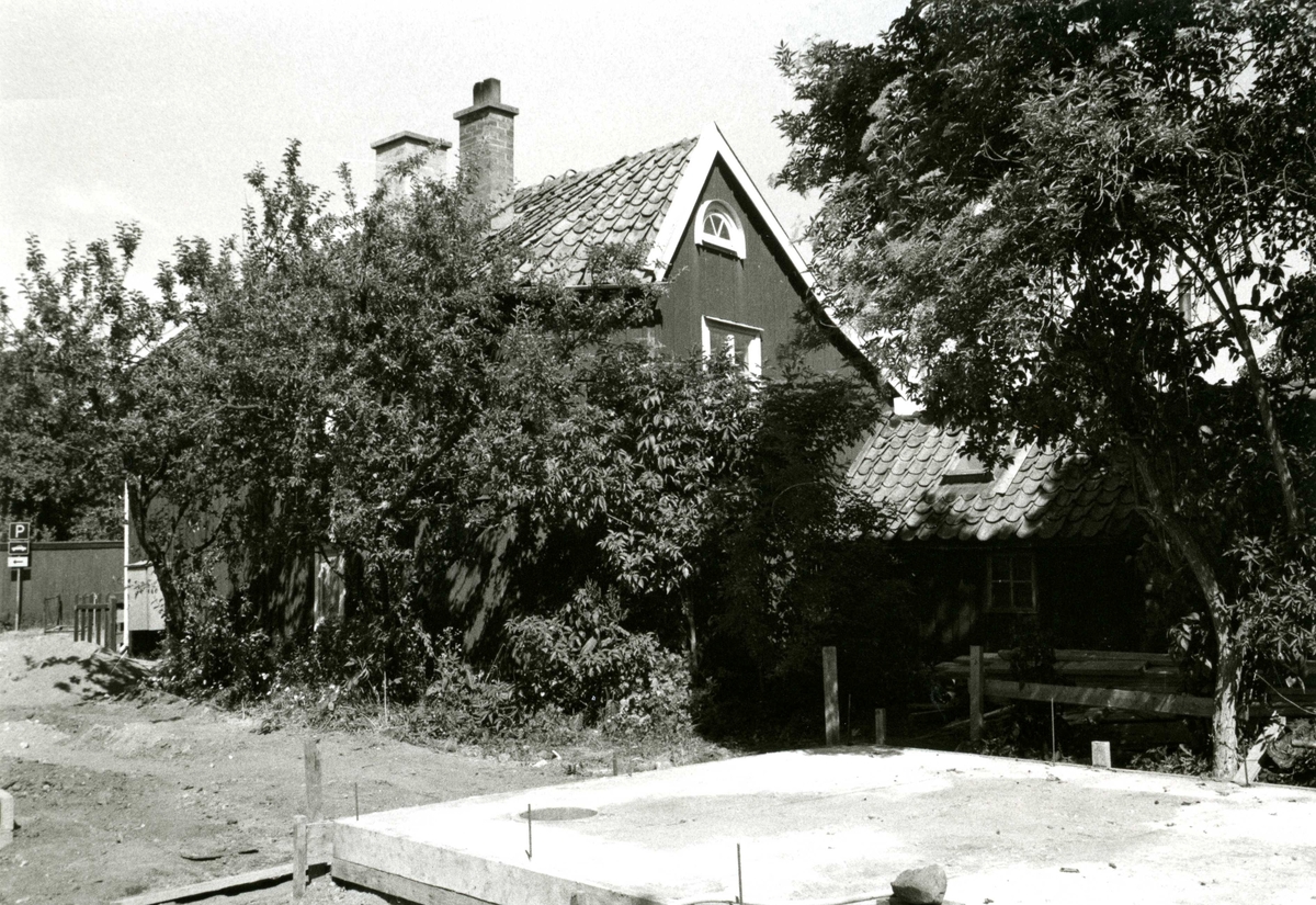 Bostadshus med sadeltak i bakgrunden och en husgrund i förgrunden, nybygge i Gamla Staden, kvarteret Björken 22.