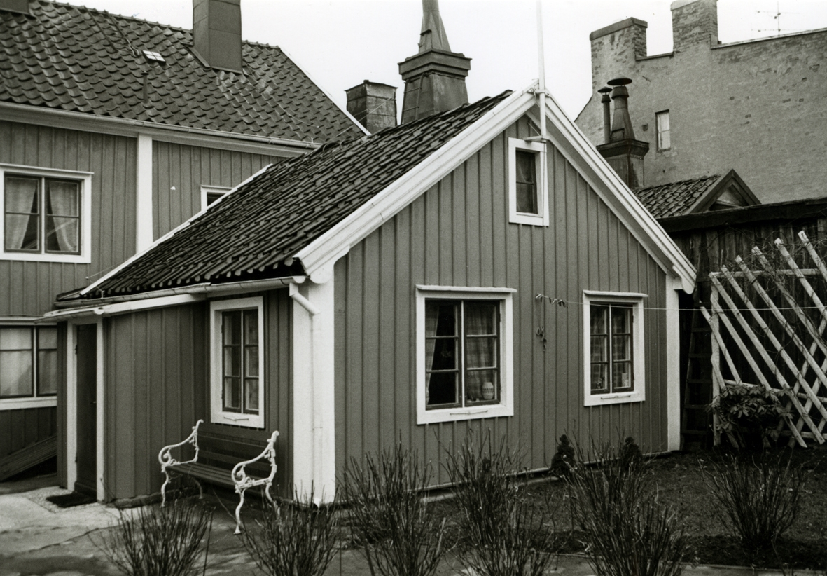Byggnader med träfasad på Kvarnholmen i Kalmar. Ett tvåvåningshus och en stuga, i vinkel mot den högre byggnaden.