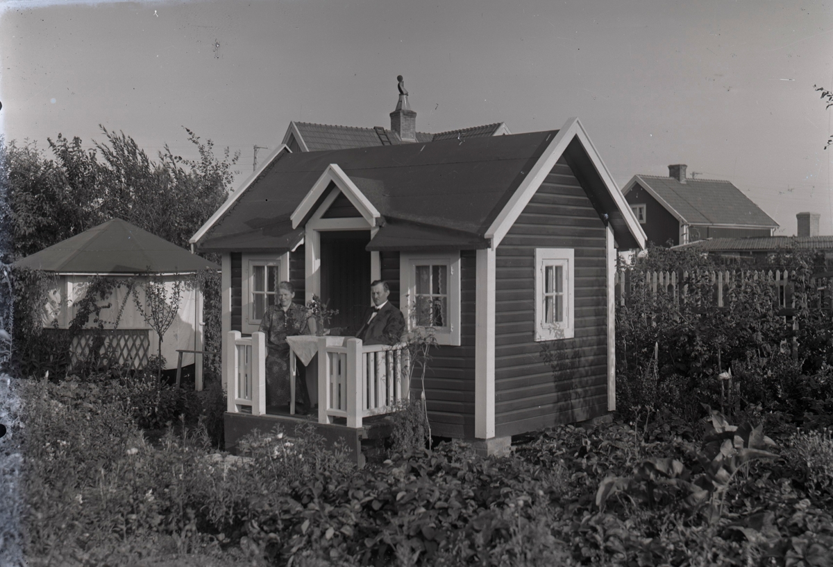 En man och en kvinna vid en stuga i Kalmar södra koloniområde, fotograferat omkring 1930. Kalmar södra koloniförening grundades 1917 och har idag 105 kolonilotter. Området ligger strax söder om länssjukhuset i Kalmar med huvudingång från Stensbergsvägen.