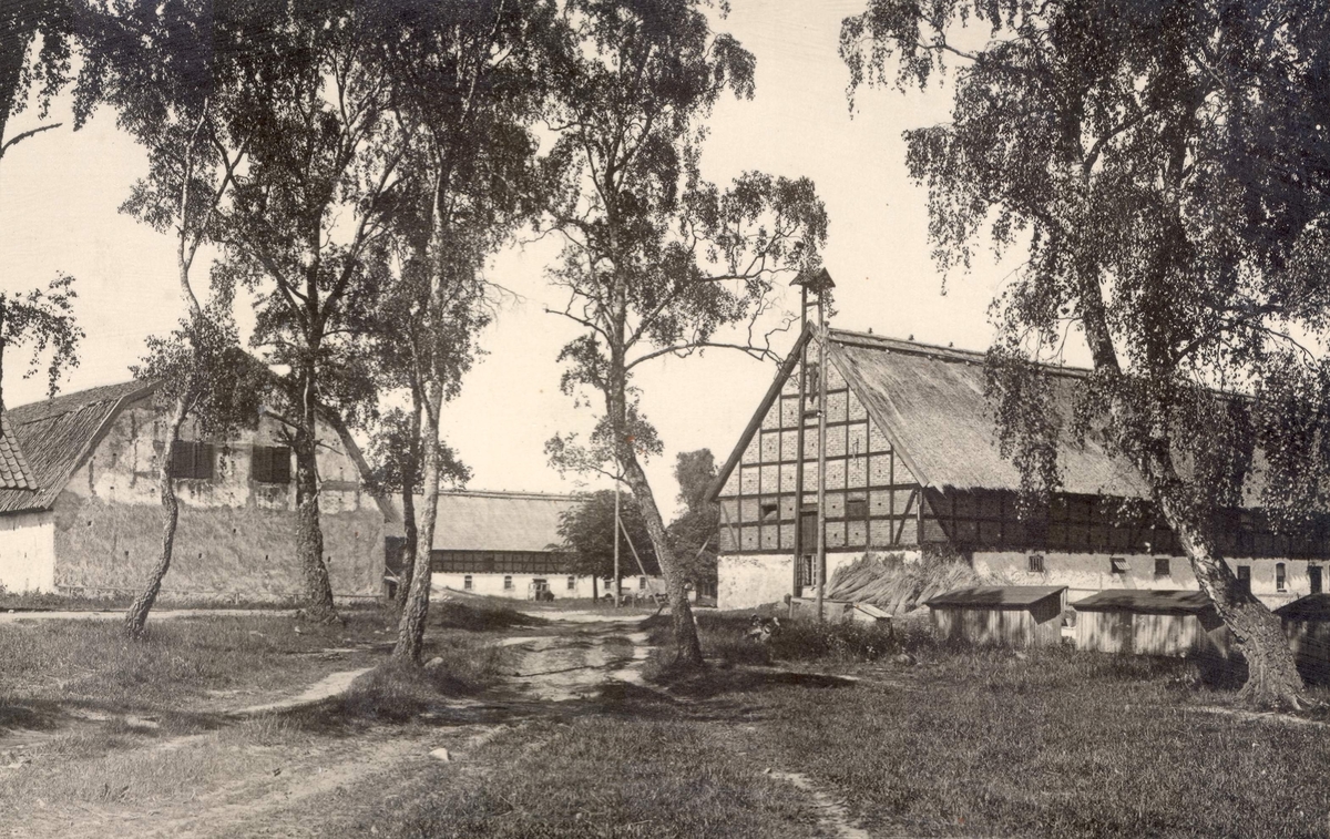 Fähus. Bottenvåningen byggd i tegel, övre våningen i korsvirke. Bundet halmtak.