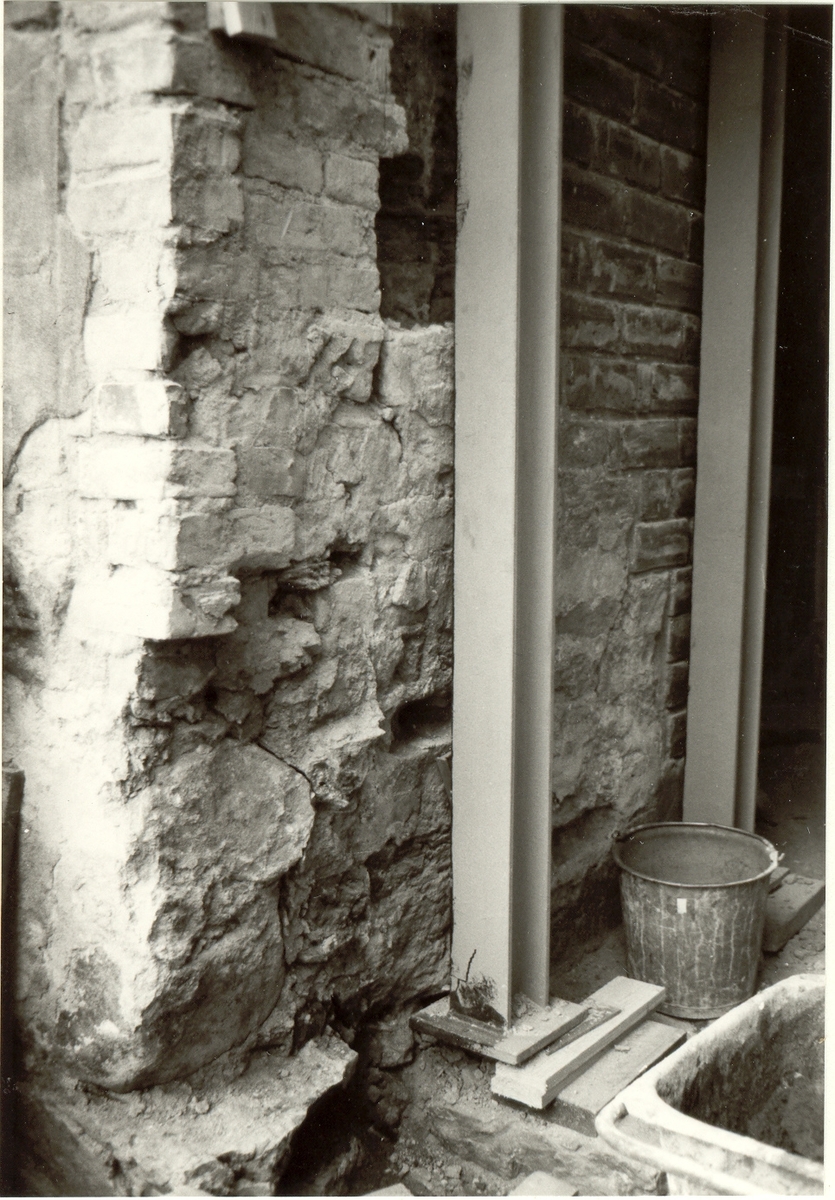 Norra väggen av den nyöppnade dörröppningen i Kungsköket, anslag strax vänster om vänstra benet i stålbygeln, Kalmar slott.