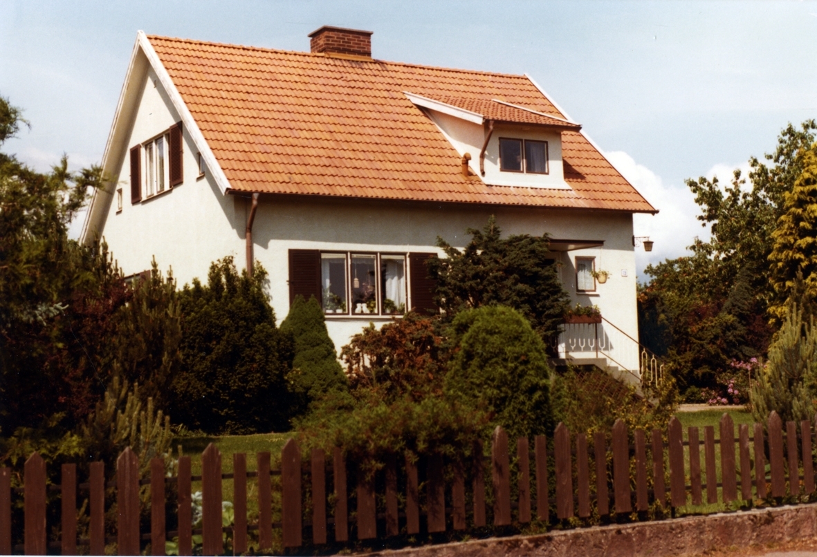 Bostadshus med vit putsad fasad, trappa, takkupa och sadeltak i Skogsliden. Ägaren hette Österberg och byggmästaren var Bertil Danielson.
