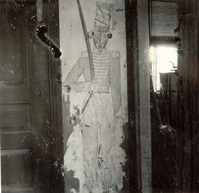 Husar, målning med limfärg å klistrat papper. Gamla byggnadens inre förstuvägg mellan dörrarna till respektive stugan och köket. Möjligen målad av prosten Brander på Skälsnäs, som även ägde Nogård såsom utgård.