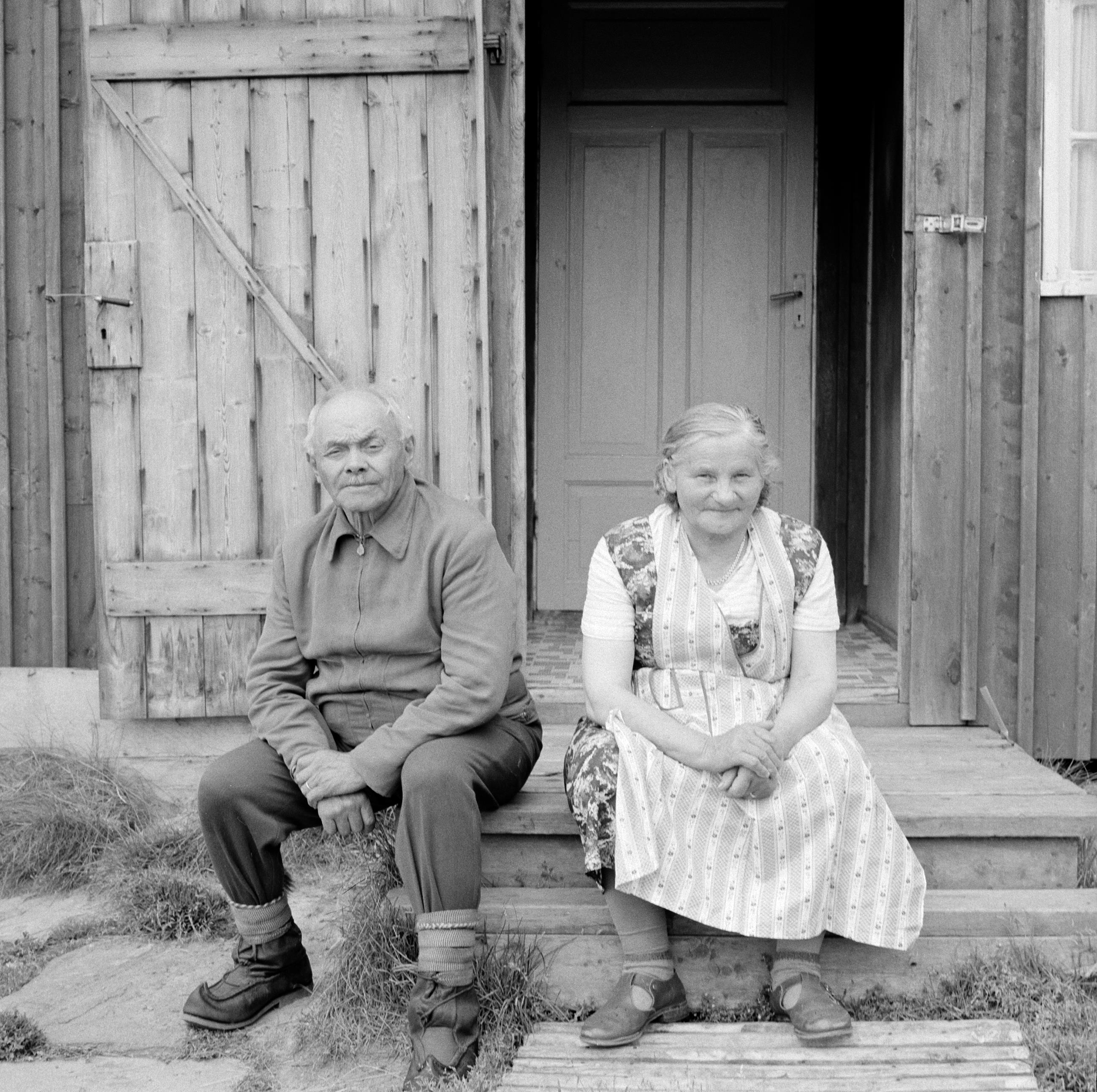 Sara, 68 år och Anders Gustav Fjällman, 78 år, på trappan till sitt hus på Kruompa sameviste.