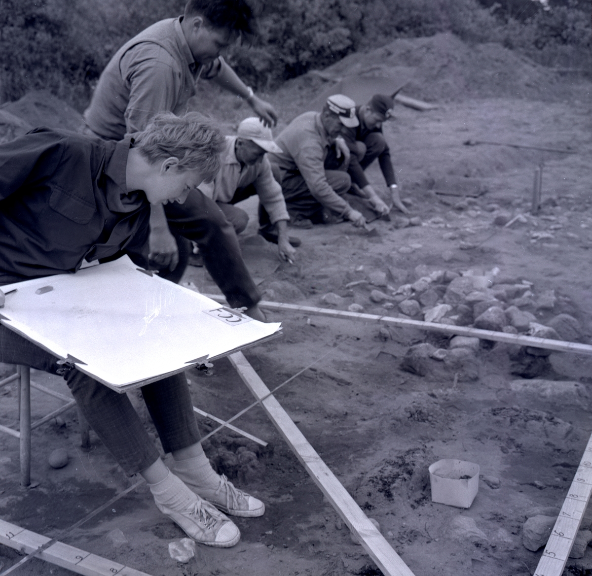 Ulf Erik Hagberg och eventuellt Margareta Beskow arbetar med arkeologiska mätningar i Bredsättra socken.