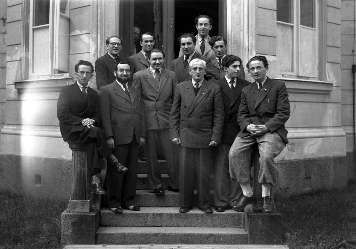 Män som räddats från koncentrationsläger till Sverige poserar på trappan till Beredskapssjukhuset.