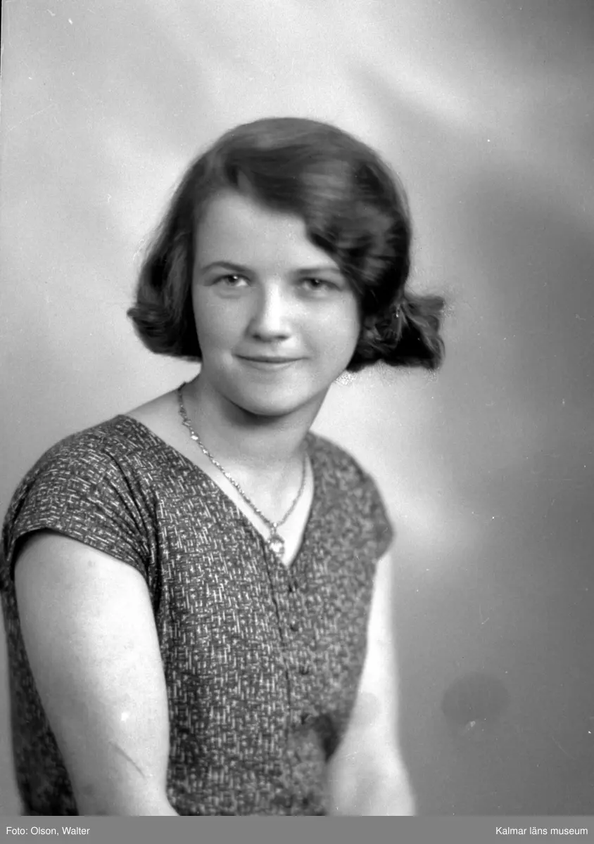 Ateljébild på en kvinna i klänning och halsband med hänge. Enligt Walter Olsons journal är bilden beställd av Ruth Svensson.
