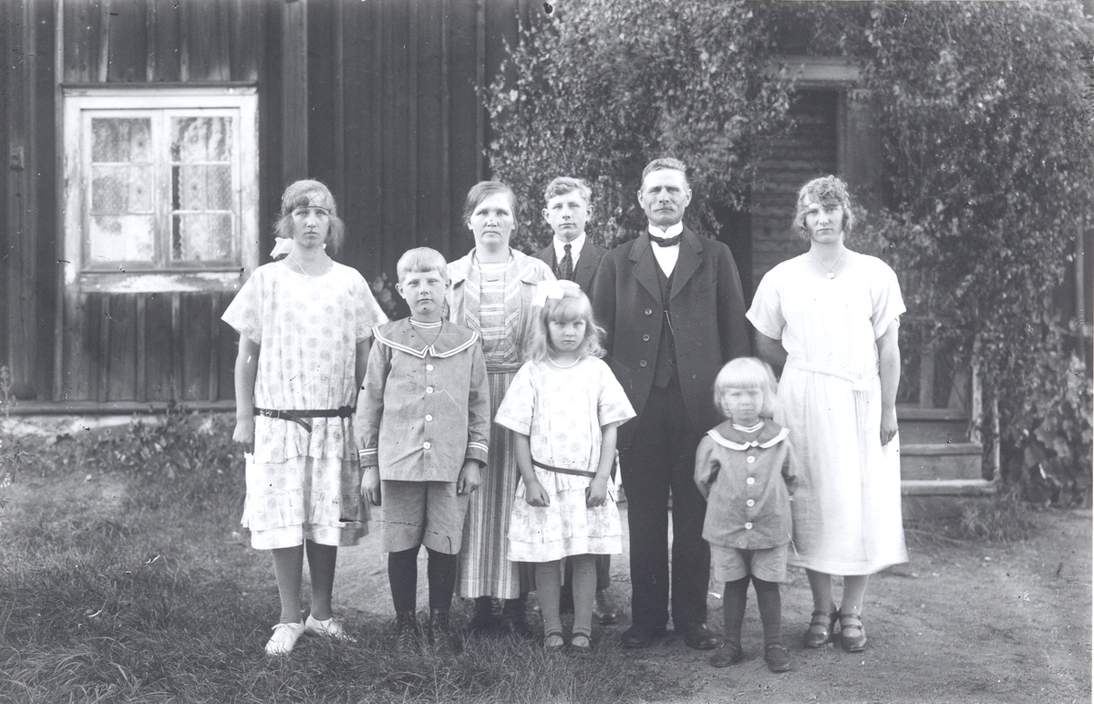 Familjen Karlsson i Höghult, Misterhult, Makarna Oskar och Hanna Karlsson med barnen, fr.v.: Ebba, Ivar, Agnes g. Johansson, Erik, Margareta och Lennart.