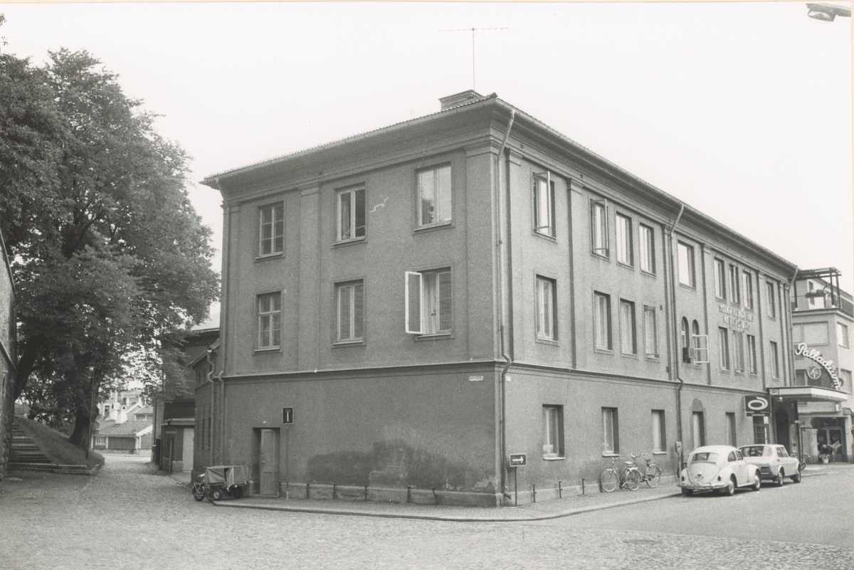 Fasad mot Västra Vallgatan - Norra Långgatan, Kvarnholmen väster om Västra Sjögatan. Bilderna är tagna inom ramen för Kalmar kommuns inventering av Kvarnholmens bebyggelse 1970-1971 och skänkta till länsmuseet.