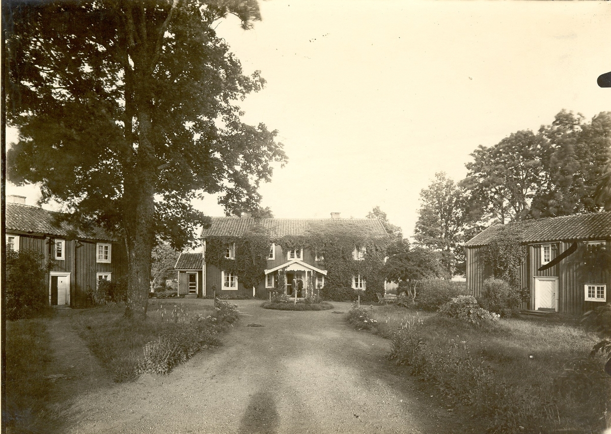 "Huvudbyggningen och de två snedställda flyglarna. T.v. "Kandidatflygeln", t.h. visthuset. Övre våningen lär vara byggd omkr. 1770, den undre från 1670. Allt enligt uppgift."