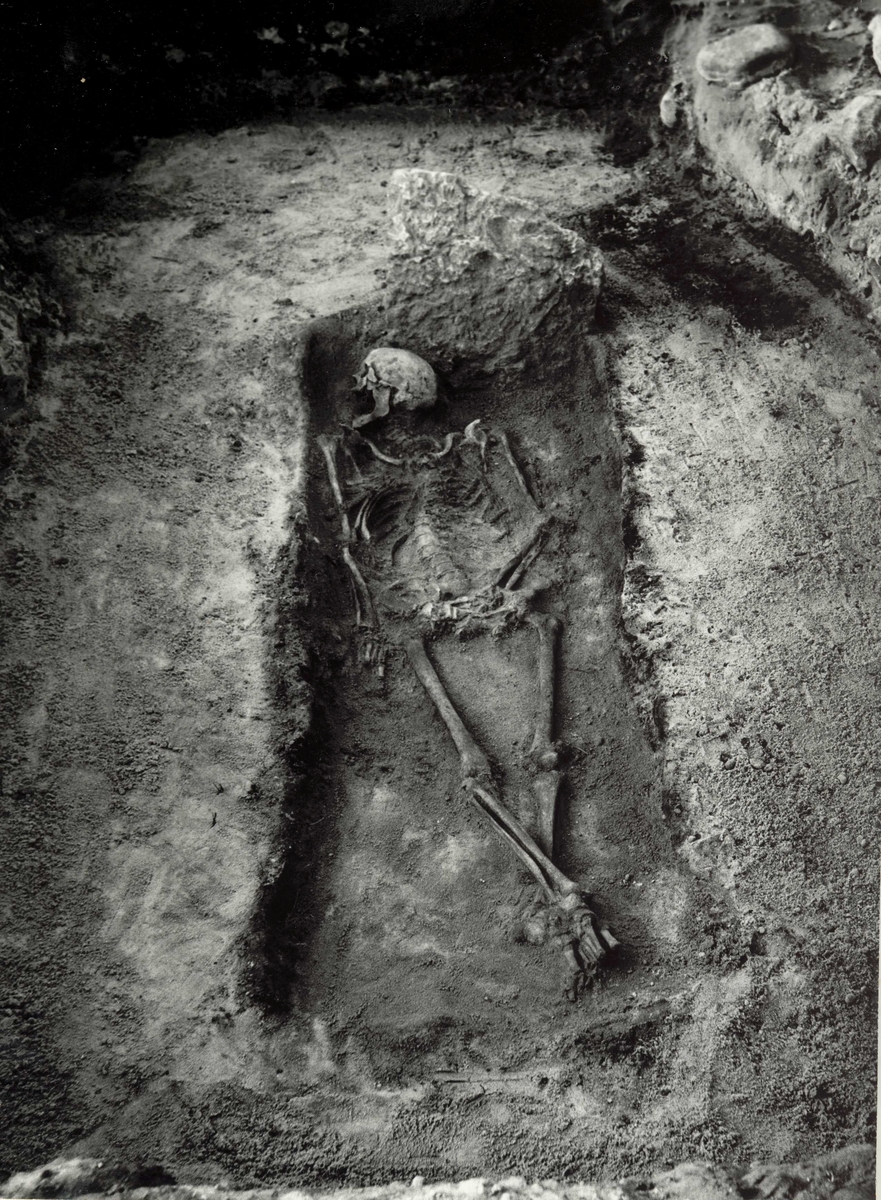 A13. Framrensat skelett av människa. Längs kanterna av nedgrävningen syns en mörkfärgning, möjligen härrörande från träkista, bark, tyg eller dylikt.