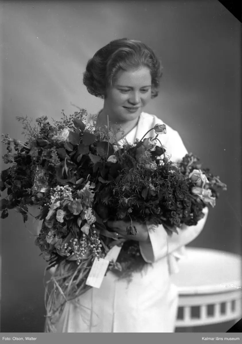 Ateljébild på en kvinna som håller i en blombukett i konfirmationssammanhang. Enligt Walter Olsons journal är bilden beställd av Arne Lindén.