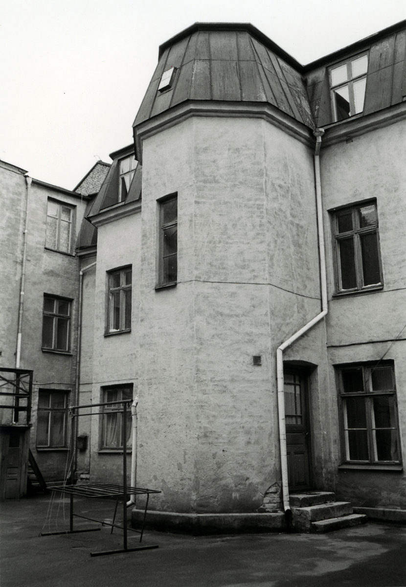 Bakgårdsmiljö på Kaggensgatan i Kalmar. Till vänster i bild skymtar en del av ett trapphus och framför huset står en piskställning för mattor.