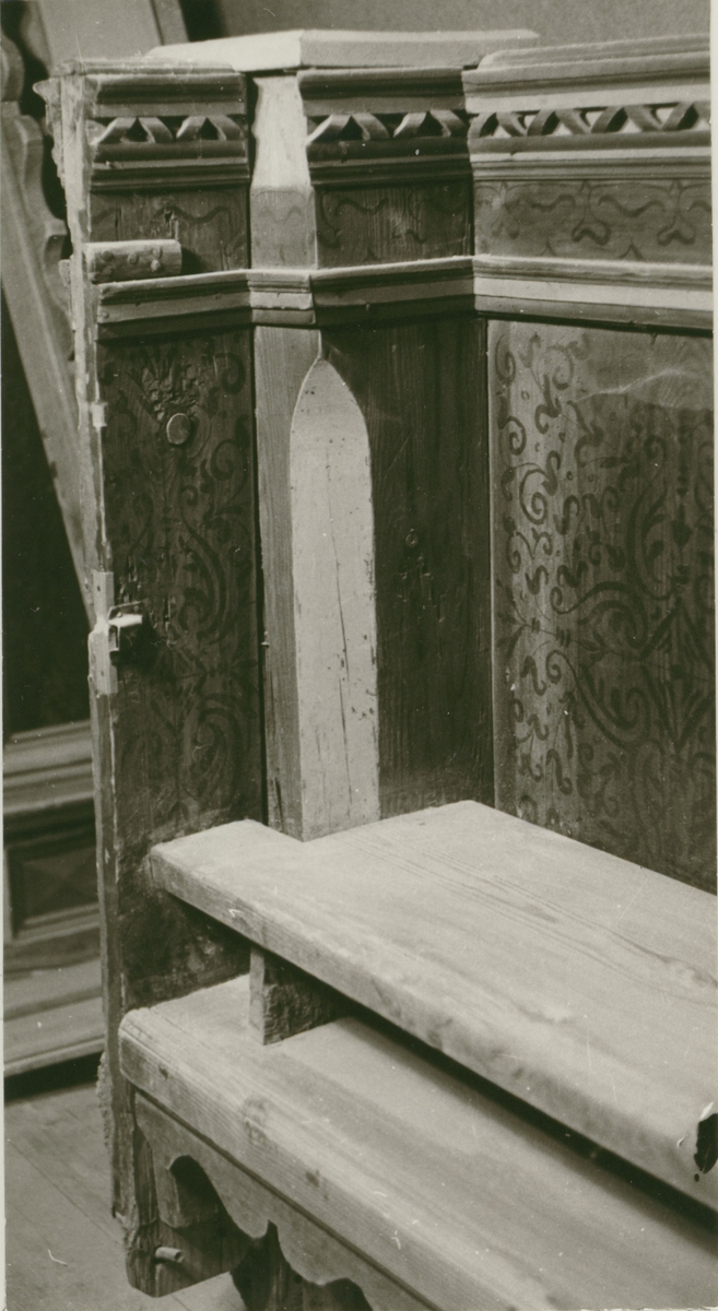 Detalj av drottningstolen i Slottskyrkan. Insidan av norra gaveln, sydvästra hörnet.