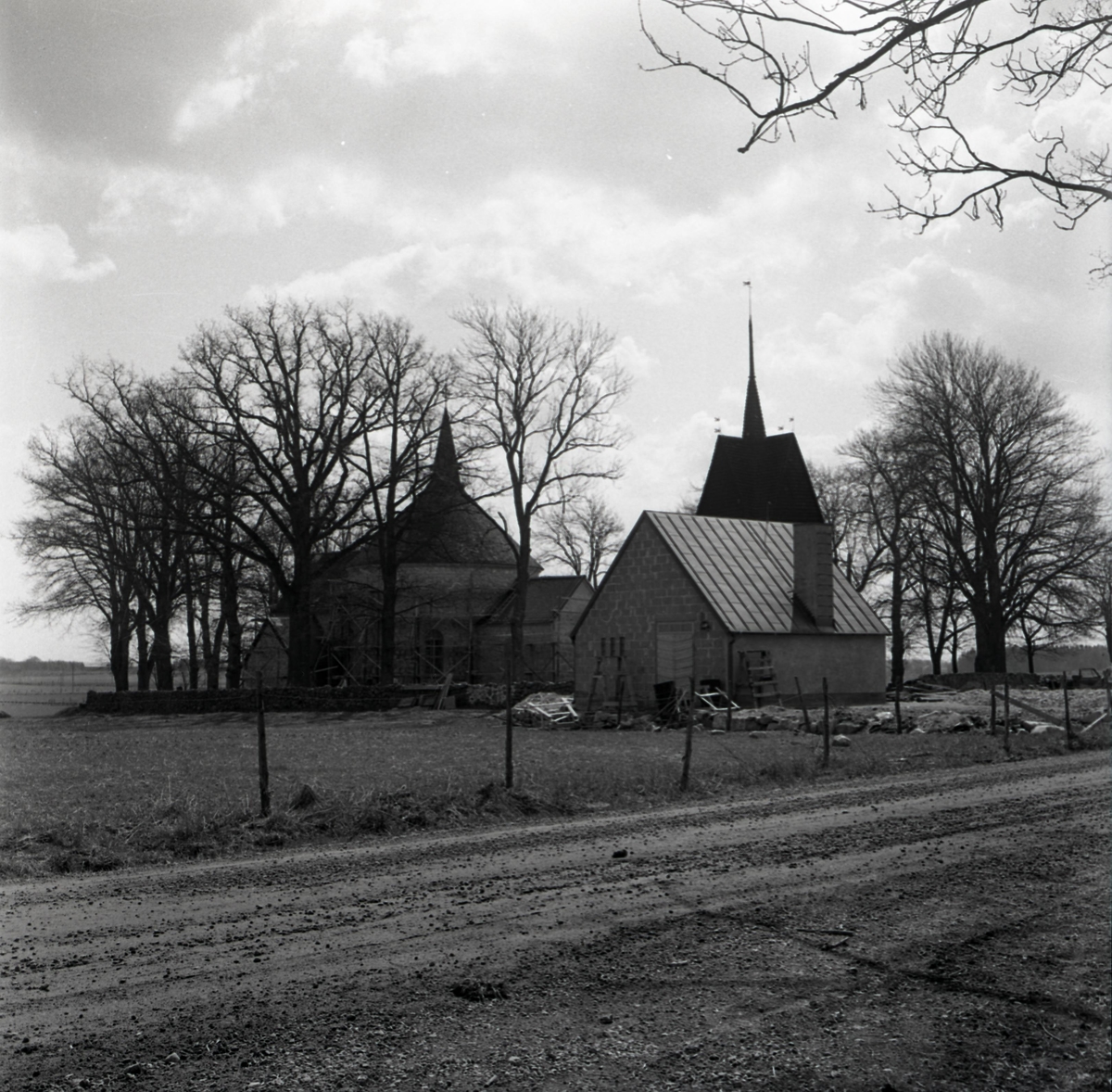 Voxtorps kyrka och det 1959-60 uppförda bårhuset från nordväst.