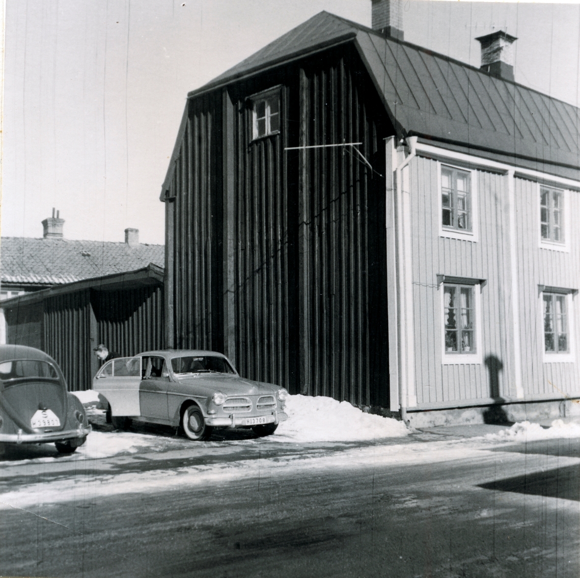 Bilar på uppfarten till en större träbyggnad på Norra Långgatan 55. Manne Hofrén bodde själv i detta hus.