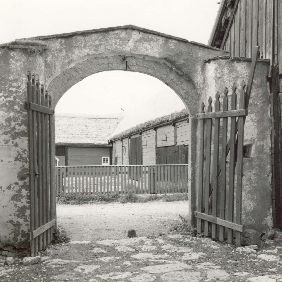 Porten sedd utåt. I fonden syns Södra Norrby 7:3.