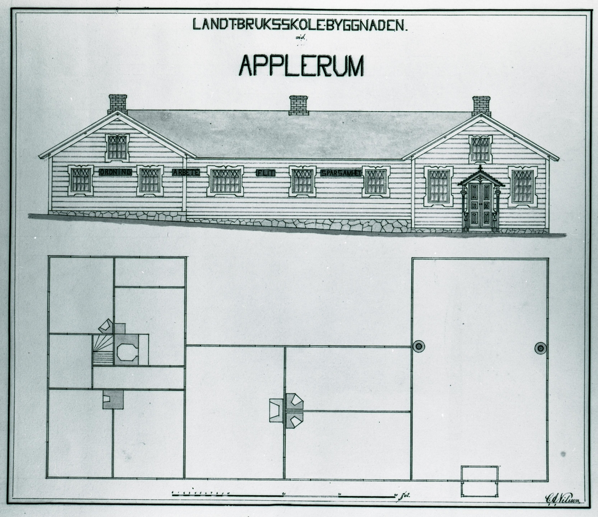 Lantbruksskolebyggnaden. Akvarellerad teckning av C A Nilsson.