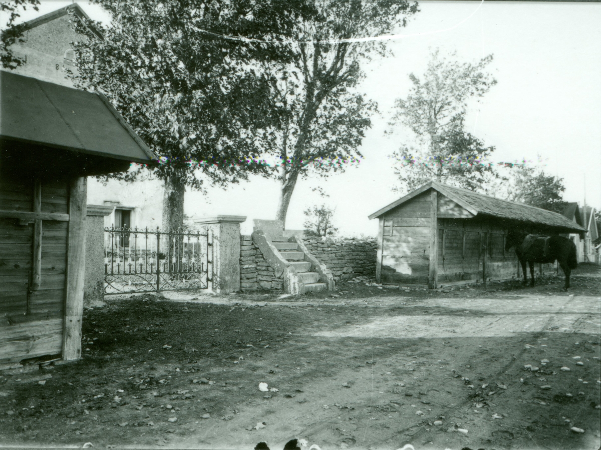 Bild som visar bland annat en grind, en stentrappa över en mur och en häst i Algutsrum.