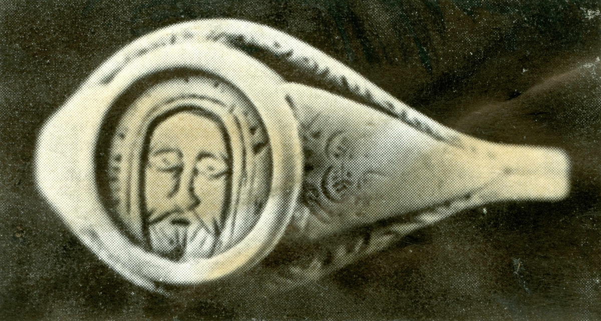 Titel: Kristusring från Algutsrum sn, inköpt omkring 1890 hos guldsmeden J.G. Hentzell i Kalmar (enskild ägo). Skenan kring klackens ringplatta är tillfogad för 50 år sedan för att skydda plattan mot nötning vid dagligt bärande av ringen. Se Kalmar Län 1963, sid. 64.