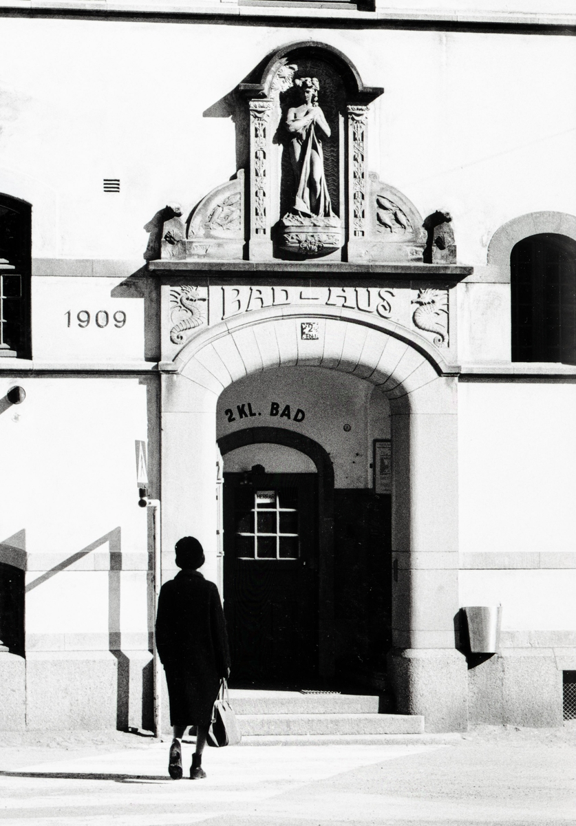 Entrédörren till varmbadhuset på Kvarnholmen.