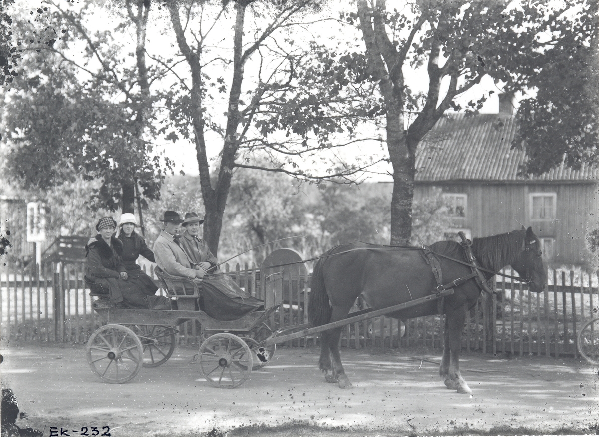 Bilden är tagen framför Kullanders hus i Västervik. Personerna från vänster: Märta Kullander-Gustafsson, *1906-11-26, Ingeborg Gustafsson, Henrik Kullander *1894.02-13 samt Martin Gustafsson.