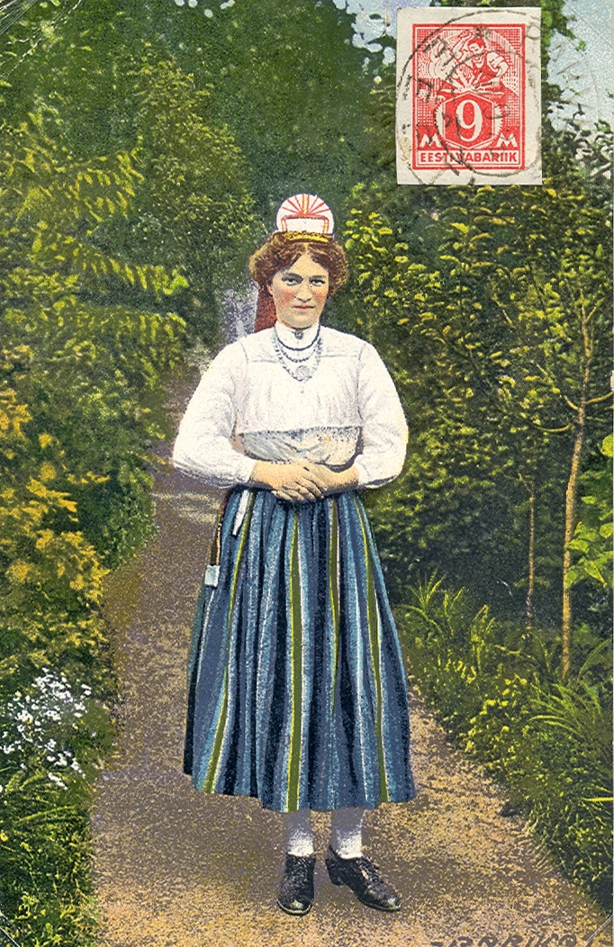 Vykort med en kvinna i folkdräkt från Estland.
