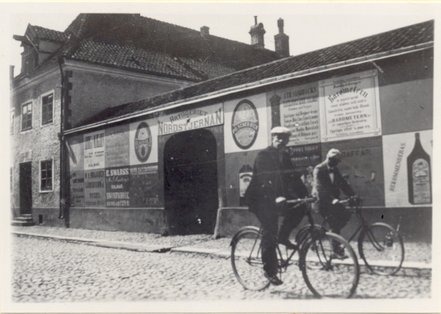 Rosenlundska huset. Gården mot Östra Sjögatan med port samt gaveln av gårdens andra stenhus. Fotot taget innan bryggeriet Nordstiernan byggdes.