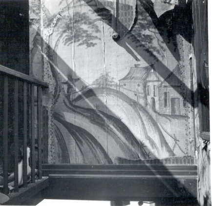 Väggmålningar i trappan till ett 1947 rivet hus vid Södra Långgatan. Grått i grått, på papper klistrat på virket. Överförda till museet.
