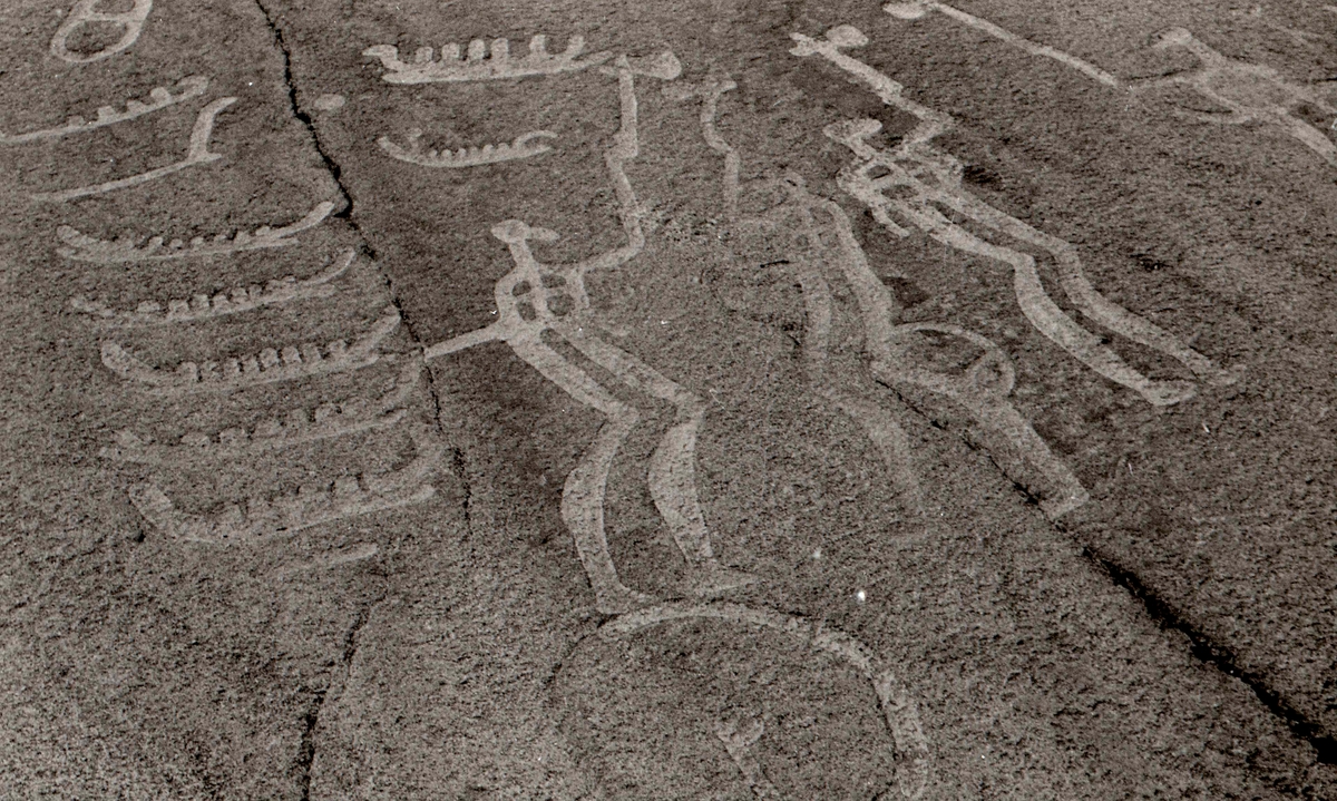 Titel: Hällristningar. Hällristningsområdet i Tanum är ett område i Tanums kommun i Bohuslän där man funnit flera berghällar med stora mängder hällristningar från bronsåldern. Runt den största av dem, Vitlyckehällen, är Vitlycke museum uppbyggt. Hällen har närmare 300 inhuggna figurer och ca 170 skålgropar. Den kanske mest berömda scenen bland alla Tanums hällristningar, "Brudparet", finns här. Bland de övriga närliggande hällarna märks Litsleby med en ca 2,3 meter lång spjutbeväpnad man, "Spjutguden", och Aspeberget med en plöjningsscen, ett antal oxar och skepp. Hällen vid Fossum ligger en bit från de övriga. Den kännetecknas av en mer sammanhållen och konstnärlig komposition. Kanske är den gjord av en enda ristare. Hällristningarna har i modern tid fyllts i med röd färg för att göra dem tydligare. Det är inte känt om de var målade från början. (Hämtat från Wikipedia)