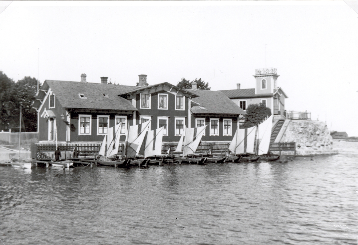 Bastion Regeringen med det första varmbadhuset, Byggnaden uppe på bastionen är den första lotsutkiken på Kvarnholmen.
