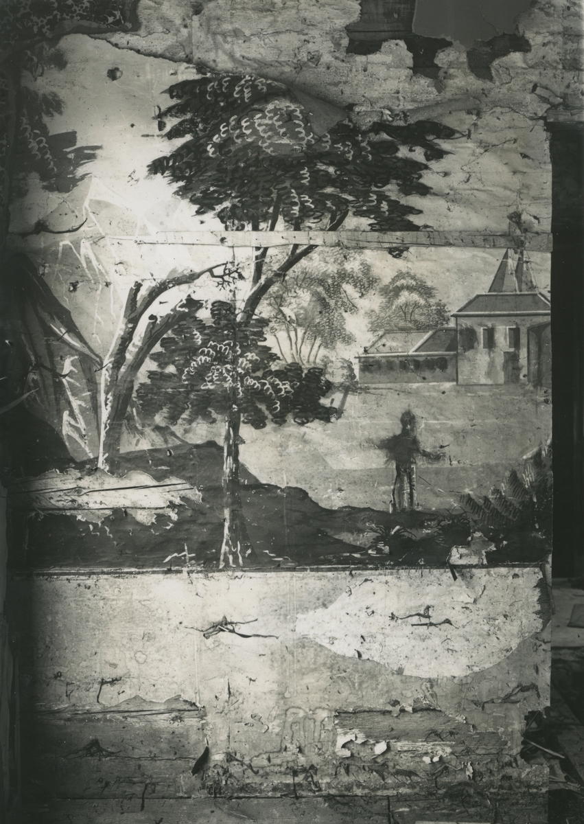 Turisthotellet. Tapet, målad på lumppapper, klistrat på timret. Grått och vitt. Upptäckt. vid riving av huset 1938. Nedre botten, hörnrummet till höger om ingången.