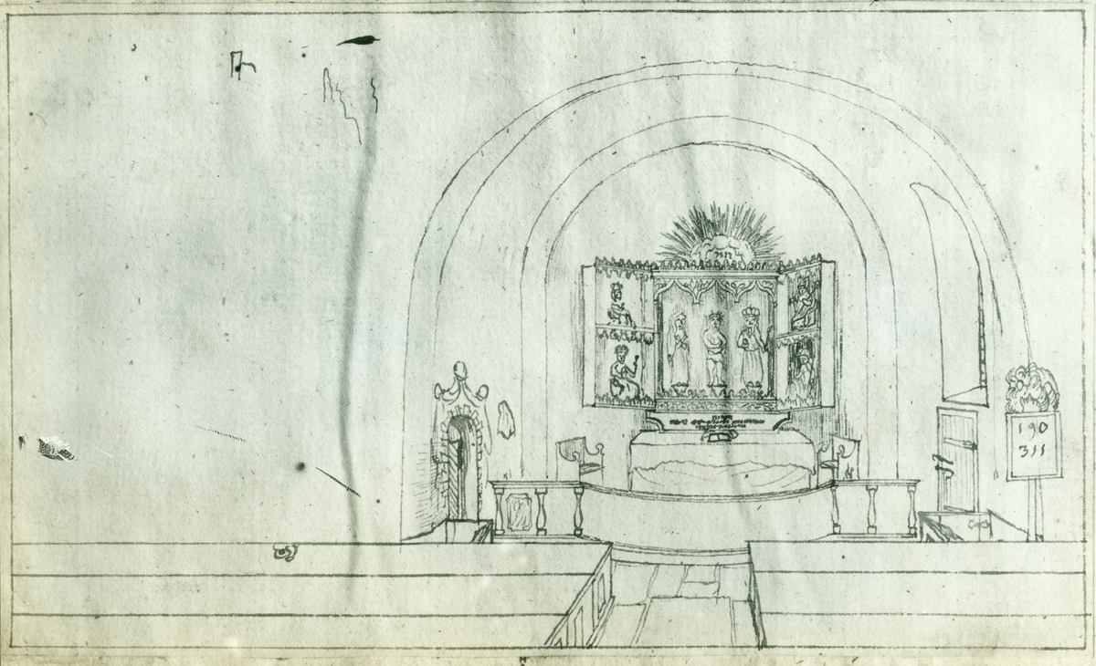 Interiör av Algutsrums kyrka med det medeltida altarskåpet.