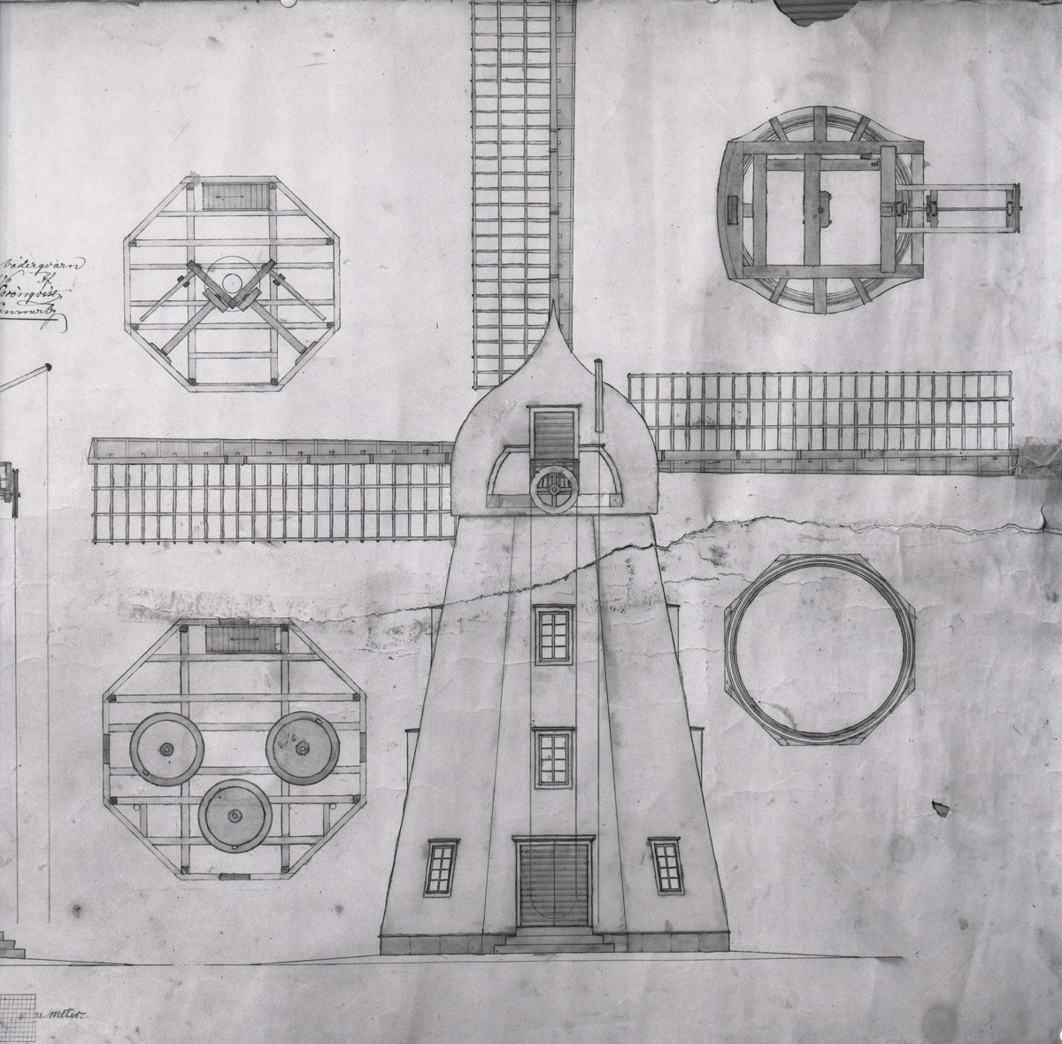 Fasadritning och planritning av holländarkvarn.