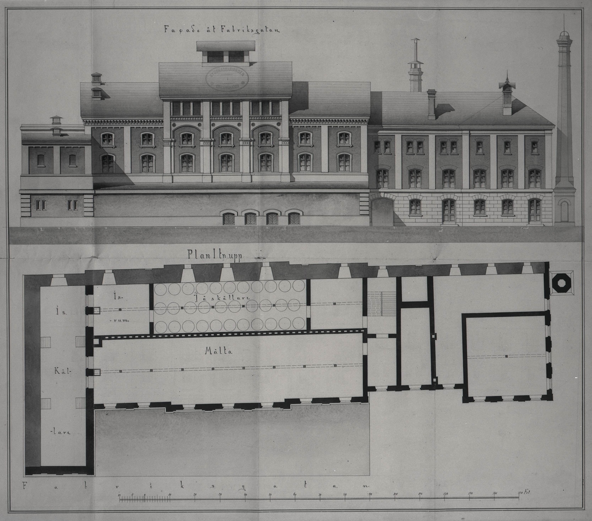 Fasad- och planritning av byggnad vid Fabriksgatan i Oskarshamn.
