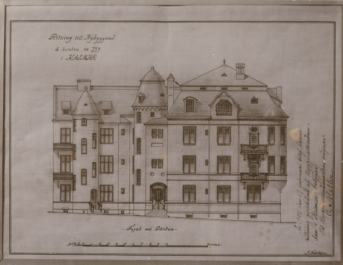 Ritning till bostadshus vid Esplanaden av J Fred Olsson.