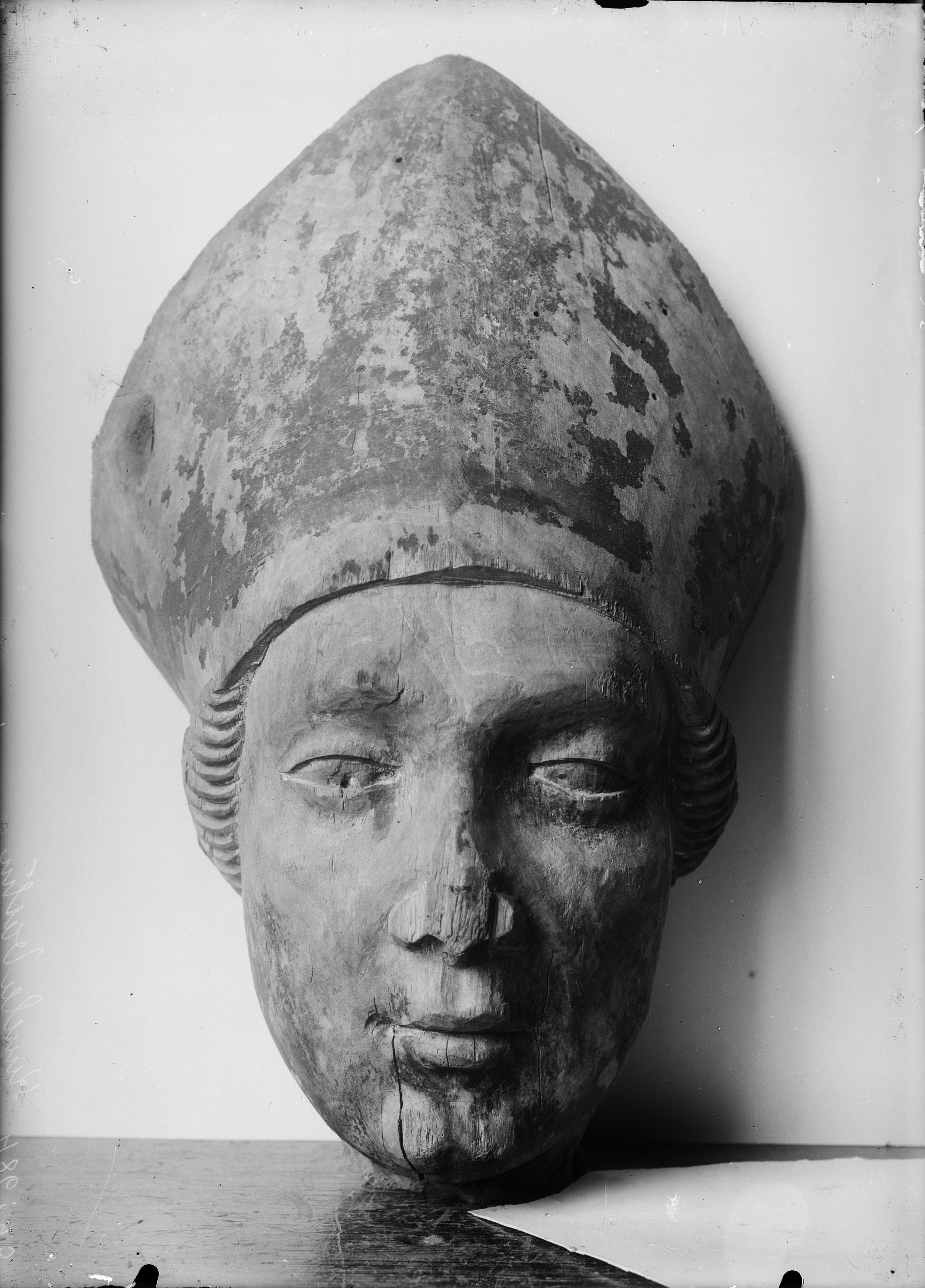 Medeltida biskopshuvud. Mitran lågt över pannan. Huvudet har utförts i två halvor, nackpartiet saknas.