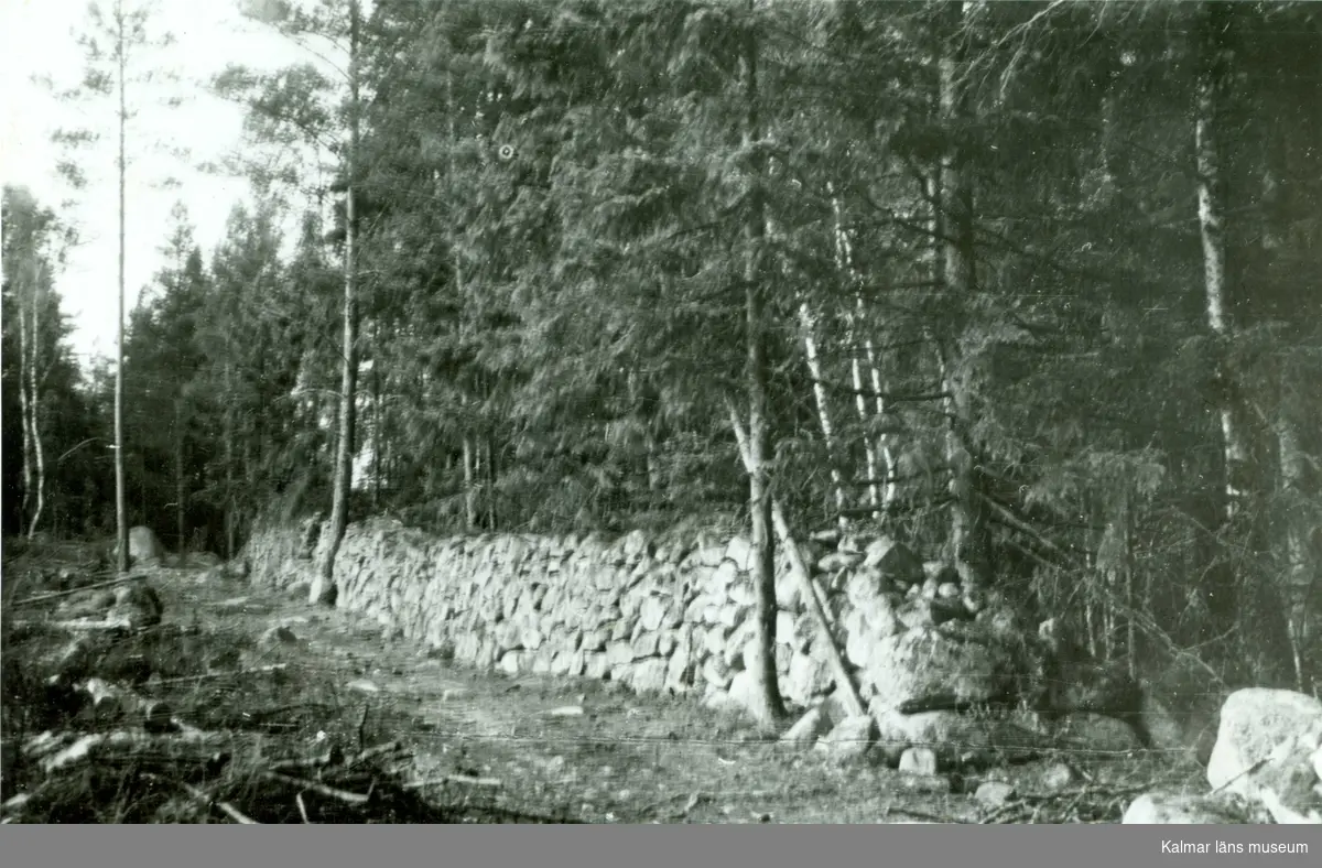 Befästningsanläggning i skogen i Starbäck. Ett stycke av västra omfattningsmuren.