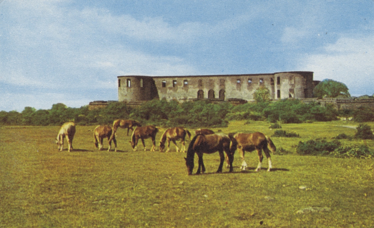 Borgholms slottsruin, med betande hästar på Alvaret i förgrunden.